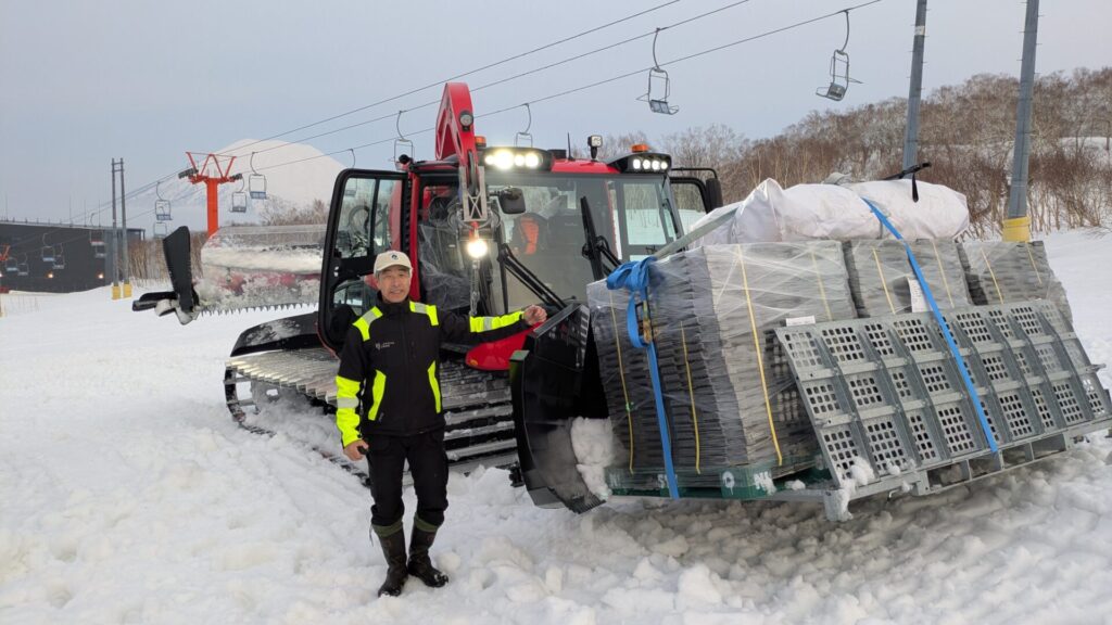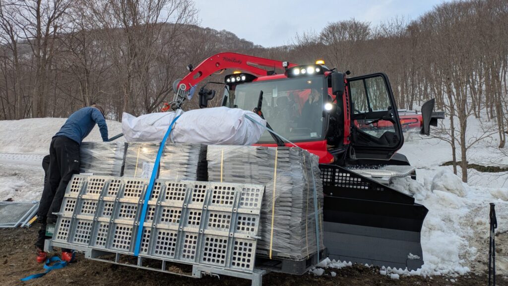 雪上搬送|圧雪車による山頂への資材運搬